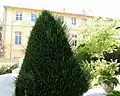 De chaque côté de l'avant-corps, et sur chacun des étages, s'ouvrent trois fenêtres hautes, ornées d'une grille en fer forgé sur le premier et le second étages.
