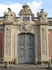 Le portail extérieur existe toujours. Il est surmonté d'une couronne royale sur un soleil, encadré par des trophées guerriers. Des reliefs sculptés sur les pilastres représentent des cornes d'abondance d'où sortent des brevets d'officiers et des croix de Saint-Louis. On y voit aussi des plans de forteresses et des armes.