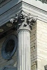 L'étage est orné de six hautes colonnes cannelées d'ordre corinthien[2] qui soutiennent un puissant entablement à frise de denticules dont l'architrave porte le millésime 1836 (MDCCCXXXVI)[1]. Toute la largeur de l'étage est occupée par un balcon à balustrade[1] sur lequel s'ouvrent cinq hautes portes-fenêtres dont l'encadrement de pierre est sommé d'un fronton triangulaire et d'un médaillon orné d'un buste. Chacune des façades latérales de cet avant-corps est pareillement ornée d'une balustrade, d'une porte-fenêtre, d'un fronton et d'un médaillon.