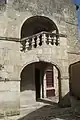 Ce bâtiment est construit en moellon et couvert d'un toit à longs pans et d'un toit à un pan en tuile. Dans l'angle, s'élève la tour d'escalier, percée de fenêtres en plein cintre, avec appuis rampants garnis de balustres en pierre, et dont le haut se termine en tour de gué, logé dans un corps de bâtiment en pierre de taille couvert d'un toit en pavillon en ardoise. Le sous-sol est également desservi par deux escaliers droits[2].