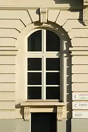 Le rez-de-chaussée est rythmé par une succession d'arcades cintrées à imposte et clé d'arc à perles et volutes, séparées par une maçonnerie à bossages plats et à lignes de refend. Autour de l'arc des arcades, les bossages adoptent un profil rayonnant, typique de l'architecture néo-classique. Dans chaque baie cintrée est inscrite une fenêtre à arc surbaissé possédant un appui de fenêtre supporté par deux corbeaux à motif de gouttes et rudentures.