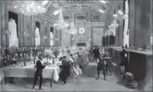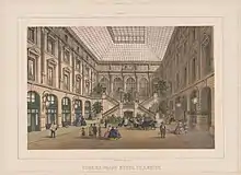 Dès 1855, 41 boutiques de luxe occupent le rez-de-chaussée du Grand Hôtel du Louvre. Constamment agrandis, les espaces commerciaux envahissent peu à peu tout l'hôtel. Celui-ci finit par céder, à la fin des années 1880, la place aux Grands Magasins du Louvre dont une publicité porte alors la légende « Tout l'hôtel du Louvre converti en magasin »[3].
