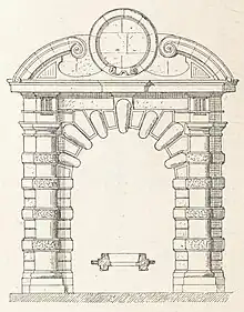 Le portail, une « porte rustique du XVIe siècle, selon Pierre Chabat », se caractérise par deux colonnes de part et d’autre de l’arcade en plein cintre avec une corniche surmontée d’un fronton brisé qui laisse place au centre à un médaillon circulaire — le tambour[4].