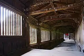 Du karamon part le couloir à découvert Funa qui mène à un autre sanctuaire sur l'île, le Tsukubusuma (voir ill. 8). Le couloir Funa a ceci de particulier qu'il est construit avec le bois du « Nihonmaru », le navire de Toyotomi Hideyoshi.