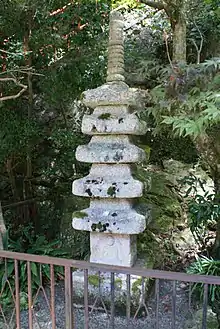 Il existe également une statue (voir ill. 3) d'une pagode miniature faite de pierres supposées provenir du célèbre mont Hiei. En raison de son origine particulière, c'est l'un des sept monuments de pierre comparables[9]. Elle possède quatre étages et dispose d'une décoration en forme de parapluie à son sommet. Cette décoration en flèche est le symbole du Bouddha et de sa royauté. Par ailleurs, sur la tranche inférieure de chaque côté se trouve une image de Bouddha[9]. Le style architectural de la pagode n'est pas sans rappeler le style de l'époque de Kamakura. Cela se voit à l'inclinaison croissante de la pente du toit de l'étage supérieur[2].