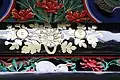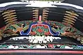 Les tuiles rondes portent l'image d'une fleur en forme de roue, la roue étant importante car elle est un symbole du dharma qui signifie la loi bouddhique, la cosmologie et le cycle de la réincarnation. Il y a une brillante volute florale en or sur les poutres des avant-toits, en haut des portes et sur les différentes articulations du karamon. Peintures et gravures de fleurs sont largement utilisées dans la décoration d'ensemble de la porte dont tout un côté est couvert de sculptures en bois de pivoines. En outre, une figure sculptée d'un brillant phénix doré et des décorations de nuages se trouvent dans l'espace triangulaire sur le côté du toit. Les phénix sont aussi une décoration populaire pour cette porte. Non seulement y a-t-il des phénix vu sur le côté du toit, mais il s'en trouve également dans la partie supérieure de la porte sur le premier côté (voir ill. 5). Les phénix ne sont pas les seules créatures mythologiques représentées dans les décorations de cette porte. Sur le deuxième côté du karamon, au-dessus de la porte sur la gauche apparaît un dragon et au-dessus de la porte sur la droite se montre une figure semblable à un cheval (voir ill. 7).