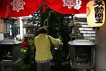 À l'exception d'une statue, il a été complètement détruit lors des bombardements de 1945. La statue de Fudō Myōō est connue pour son aspect inhabituel : elle est entièrement recouverte de mousse[2]. Verser de l'eau sur la statue, connue sous le nom de « Mizukake Fudo », est un geste porte-bonheur selon la tradition[3].