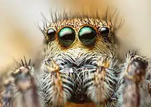 La zone oculaire est plus large en arrière qu'en avant. La première rangée d'yeux est droite. Les yeux médians se touchent. Les yeux latéraux antérieurs sont placés à la moitié de la largeur des yeux médians et en sont séparés par un tiers de leur propre diamètre. Les yeux de la deuxième rangée sont placés à mi-chemin entre les yeux latéraux et postérieurs. Les yeux postérieurs sont un peu plus petits que les yeux latéraux[6].