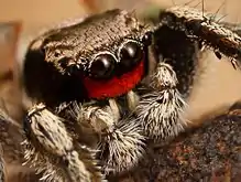 Le céphalothorax présente une marque rouge sous les yeux[5] constituée de soies rouge vif recouvrant le clypéus[8] avec la face noire[5] présentant des bandes latérales au-dessus des yeux[8]. Les chélicères présentent une grande tache blanche distincte[8].