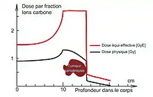 - quand il s'agit d'ions carbone, l'efficacité en termes de destruction des cellules tumorale est, à dose équivalente, très supérieure à celle des photons ou des protons.