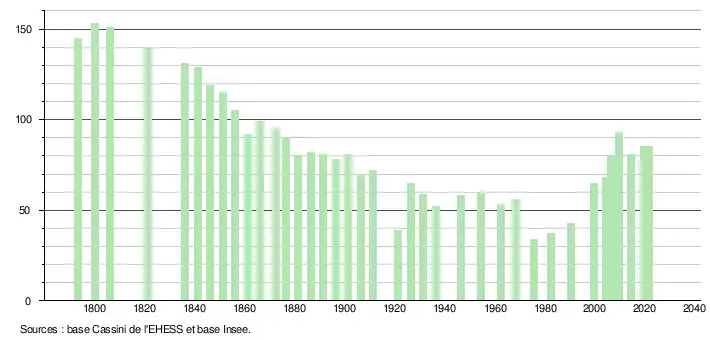 L'évolution du nombre d'habitants est connue à travers les recensements de la population effectués dans la commune depuis 1793. Pour les communes de moins de 10 000 habitants, une enquête de recensement portant sur toute la population est réalisée tous les cinq ans, les populations légales des années intermédiaires étant quant à elles estimées par interpolation ou extrapolation[25]. Pour la commune, le premier recensement exhaustif entrant dans le cadre du nouveau dispositif a été réalisé en 2004[26].