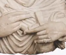 Le schedula se compose de deux tablettes séparées et ouvertes, ce qui laisse penser qu'il ne s'agit pas de tablettes d'écriture, dont le contenu serait nécessairement limité, mais plutôt des deux côtés ou couvercles d'un étui destiné à conserver les stylets utilisés pour l'écriture. Le schedula est un terme utilisé par Ingholt le plus grand archéologue de Palmyre[6]. C’est donc deux termes très floues et nous avons du mal à comprendre leur utilité mais tout le monde s’accorde sur cette version de l'académie royale danoise des sciences et des lettres. Le terme bénéficiaire est d'origine romaine dans l'inscription il est donné sans traduction, en transcription palmyro-araméen lettre par lettre. Le portrait d’Hairan est lié à l’administration militaire, il est un non-combattant. Il tient deux objets un stylet et un schedula qui font référence à son métier[7],[8],[9],[10].