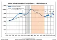 Évolution de la population dans les limites actuelles. -- Ligne bleue: Population; Ligne pointillé: Comparaison avec le développement de Brandebourg -- Fond gris: Période du régime nazie; Fond rouge: Période du régime communiste