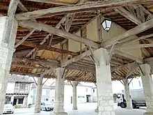 La halle est de plan carré, constituée d’une charpente formant un toit en pavillon à quatre pentes couvert en tuiles canal, reposant sur seize piliers en pierre : douze piliers périphériques de section octogonale, et quatre piliers intérieurs disposés en carré, de section carrée. La hauteur de la charpente au centre a permis d’aménager une salle en étage entre les quatre piliers centraux, en colombages et torchis, qui servait de salle de réunion à la municipalité avant la construction de la mairie.