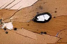 Un halo pléochroïque, (radiohalo en anglais), est une zone microscopique sphérique de décoloration par (pléochroïsme) dans des minéraux comme la biotite qu'on trouve dans les granites et autres roches magmatiques. Le halo est une zone de dégradation radioactive causée par une inclusion de petits cristaux radioactifs dans la structure du cristal. Ces inclusions se retrouvent typiquement dans le zircon, l'apatite, ou la titanite, matériaux qui peuvent insérer de l'uranium ou du thorium au sein même de leurs structures cristallines[1]. Une explication est que la décoloration est causée par des particules alphas émises par le noyau atomique ; le rayon des sphères concentriques est proportionnel à l'énergie des particules[2].