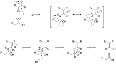 Si peu de solvant nucléophile est présent, la réaction du bromure d'α-bromo acyle avec l'acide carboxylique donne le produit acide α-bromo carboxylique et régénère l'intermédiaire de bromure d'acyle. En pratique, un équivalent molaire de PB3 est souvent utilisé de toute façon pour surmonter la cinétique de réaction lente.