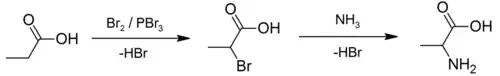 Un exemple d'utilisation de la réaction de Hell-Volhard-Zelinski peut être vu dans la préparation d'alanine. Une approche utilisant une synthèse de Strecker[4] a été décrite comme "excellente mais fastidieuse" et ainsi une alternative commençant par l'acide propanoïque a été développée. Dans sa première étape, une combinaison de brome et de tribromure de phosphore (catalyseur) est utilisée pour préparer l'acide 2-bromopropanoïque[5], qui est ensuite converti en un racémique du produit d'acide aminé par ammonolyse[6],[7].