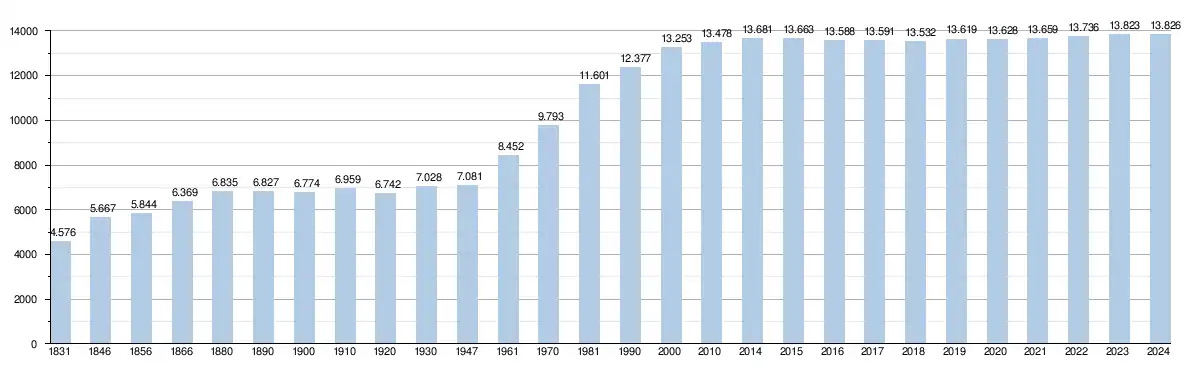 Elle comptait, au , 13 832 habitants (6 647 hommes et 7 185 femmes), soit une densité de 302,60 habitants/km²[4],[5] pour une superficie de 45,71 km².