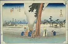 La classique estampe ukiyoe d'Ando Hiroshige (édition Hoeido) de 1831-1834 montre une scène rurale avec le château de Hamamatsu et la ville au loin. Un groupe de paysans se réchauffe à un grand feu tandis qu'un voyageur les regarde.