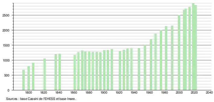 L'évolution du nombre d'habitants est connue à travers les recensements de la population effectués dans la commune depuis 1793. Pour les communes de moins de 10 000 habitants, une enquête de recensement portant sur toute la population est réalisée tous les cinq ans, les populations légales des années intermédiaires étant quant à elles estimées par interpolation ou extrapolation[20]. Pour la commune, le premier recensement exhaustif entrant dans le cadre du nouveau dispositif a été réalisé en 2008[21].