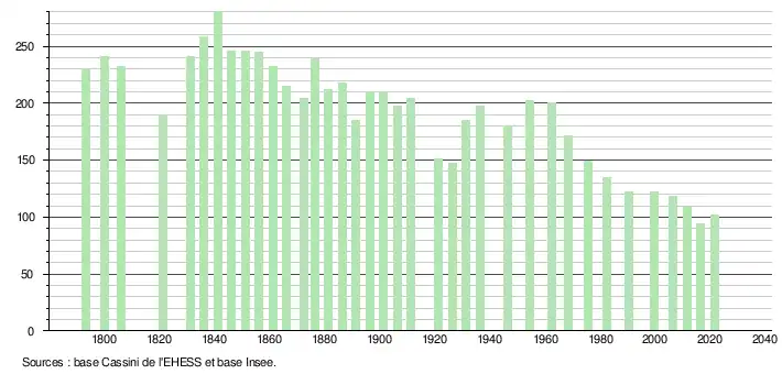 L'évolution du nombre d'habitants est connue à travers les recensements de la population effectués dans la commune depuis 1793. Pour les communes de moins de 10 000 habitants, une enquête de recensement portant sur toute la population est réalisée tous les cinq ans, les populations légales des années intermédiaires étant quant à elles estimées par interpolation ou extrapolation[26]. Pour la commune, le premier recensement exhaustif entrant dans le cadre du nouveau dispositif a été réalisé en 2006[27].