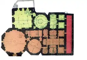 C'est un bain double, avec deux parties séparées pour les hommes et les femmes. La partie réservée aux hommes est la plus spacieuse et la plus luxueuse, mais chacune suit le même plan tripartite — une succession de trois pièces, chambre froide, tiède et chaude. Une grande citerne rectangulaire flanque les bains sur le côté est et garantit leur alimentation en eau.