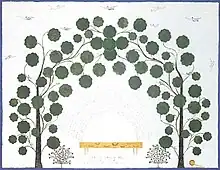 - A Bower of Mulberry Trees, 1854[1]est le résultat de la vision de Cohoon d'une fête de gâteaux par les aînés Shaker sous les mûriers[16]. La représentation de la longue table dans le dessin représente les fêtes saintes tenues lors des réunions biennales et la présence des colombes au-dessus de la tête représente les bénédictions que le croyant vivrait au ciel[17]. Germaine Greer, auteure de The Obstacle Race: The Fortunes of Women Painters and Their Work, a comparé le dessin de Cohoon à l'art primitif des artistes catholiques d'un "paradis terrestre avec des arbres en fleurs et fruitières"[16].