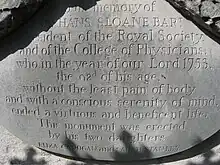 « In memory of Sir Hans Sloane, Bart, President of the Royal Society and of the College of Physicians, who died in the year of our Lord 1752, the ninety-second year of his age, without least pain of body, and with a conscious serenity of mind ended a virtuous and beneficient life. This monument was erected by his two daughters, Eliza Cadogan and Sarah Stanley »