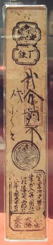 - (en) Cet article est partiellement ou en totalité issu de l’article de Wikipédia en anglais intitulé « Scrip of Edo period Japan » (voir la liste des auteurs).