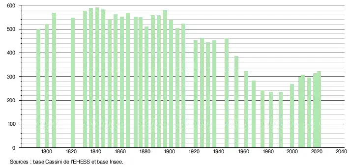 L'évolution du nombre d'habitants est connue à travers les recensements de la population effectués dans la commune depuis 1793. Pour les communes de moins de 10 000 habitants, une enquête de recensement portant sur toute la population est réalisée tous les cinq ans, les populations légales des années intermédiaires étant quant à elles estimées par interpolation ou extrapolation[21]. Pour la commune, le premier recensement exhaustif entrant dans le cadre du nouveau dispositif a été réalisé en 2008[22].