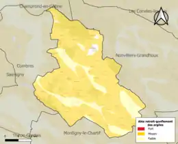 La commune est vulnérable au risque de mouvements de terrains constitué principalement du retrait-gonflement des sols argileux[16]. Cet aléa est susceptible d'engendrer des dommages importants aux bâtiments en cas d’alternance de périodes de sécheresse et de pluie. 82,7 % de la superficie communale est en aléa moyen ou fort (52,8 % au niveau départemental et 48,5 % au niveau national). Sur les 204 bâtiments dénombrés sur la commune en 2019, 169 sont en aléa moyen ou fort, soit 83 %, à comparer aux 70 % au niveau départemental et 54 % au niveau national. Une cartographie de l'exposition du territoire national au retrait gonflement des sols argileux est disponible sur le site du BRGM[17],[Carte 2].