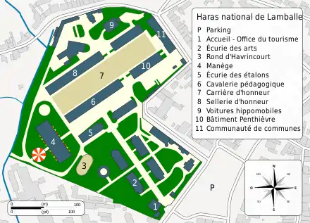 Le haras national de Lamballe est situé en plein centre-ville[H 3]. Par comparaison aux autres haras nationaux français, il présente des bâtiments concentrés dans un espace relativement restreint, de l'ordre des 5 hectares[49].