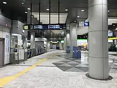 La station dispose de quatre accès dont un principal équipé d'un escalier mécanique. Pour les personnes à la mobilité réduite un parcours spécifiques est signalé avec un ascenseur pour rejoindre le niveau -1 puis un deuxième ascenseur pour rejoindre le quais de la station[2]. La carte ICOCA est possible pour l’accès aux portillon d’accès aux quais.