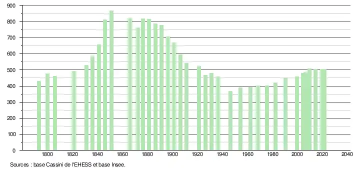 L'évolution du nombre d'habitants est connue à travers les recensements de la population effectués dans la commune depuis 1793. Pour les communes de moins de 10 000 habitants, une enquête de recensement portant sur toute la population est réalisée tous les cinq ans, les populations légales des années intermédiaires étant quant à elles estimées par interpolation ou extrapolation[18]. Pour la commune, le premier recensement exhaustif entrant dans le cadre du nouveau dispositif a été réalisé en 2004[19].