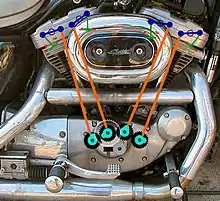 La construction des moteurs Sportster de Harley-Davidson n'a pratiquement pas changé depuis son lancement en 1952 comme modèle « K » à soupapes latérales. Son architecture moteur-boite a été conservée avec la mise à niveau du moteur Evolution en 1986, ce qui a permis de créer une configuration de train de soupapes unique. Contrairement à la plupart des autres moteurs actuellement en production, le Sportster Evolution utilise quatre arbres à cames pour actionner les soupapes en tête du moteur. Ces arbres comportent chacun un lobe et sont entraînés par engrenages. Les lobes de came sont ainsi tous situés sur une ligne quasi horizontale et forment, avec leurs pignons placés en éventail, une sorte de cascade. Les biellettes sont donc disposées deux à deux (avant et arrière) parallèlement à l'axe du cylindre. Cela permet à chaque poussoir de dévier des lobes de la came perpendiculairement au plan des lobes. Cette configuration, particulièrement efficace pour les cames radicales à haut rendement, faisait du Sportster Evolution un choix naturel pour la gamme de motos de sport Buell Motocycle Company, marque appartenant à Harley-Davidson de 1986 à la fin de 2009 (année modèle 2010).