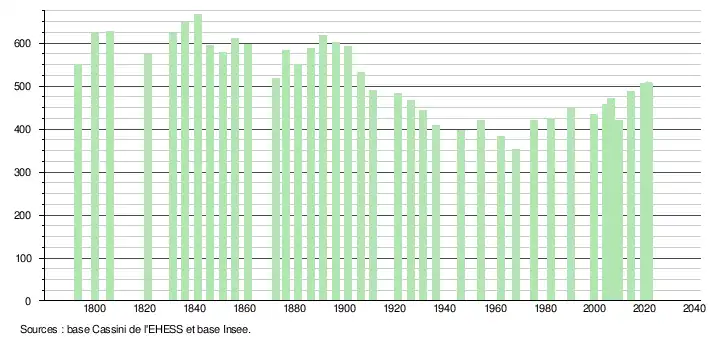 L'évolution du nombre d'habitants est connue à travers les recensements de la population effectués dans la commune depuis 1793. Pour les communes de moins de 10 000 habitants, une enquête de recensement portant sur toute la population est réalisée tous les cinq ans, les populations légales des années intermédiaires étant quant à elles estimées par interpolation ou extrapolation[23]. Pour la commune, le premier recensement exhaustif entrant dans le cadre du nouveau dispositif a été réalisé en 2004[24].
