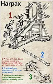 Le harpax permet à un navire ennemi d’être harponné puis treuillé pour l’abordage. Il est d’abord déployé à la bataille de Nauloque en 36 av. J.-C. Appien explique que le dispositif était « appelé la griffe », formé d'une pièce de bois longue de cinq coudées, liée avec du fer et ayant des anneaux aux extrémités. À l’un de ces anneaux, la griffe elle-même, une griffe de fer, était attaché aux autres nombreuses cordes, qui la tirait par la puissance de la machine après qu’il avait été lancé par une catapulte et s'était accroché aux navires de l’ennemi »[2],[3].