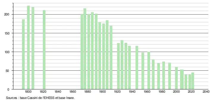 L'évolution du nombre d'habitants est connue à travers les recensements de la population effectués dans la commune depuis 1793. Pour les communes de moins de 10 000 habitants, une enquête de recensement portant sur toute la population est réalisée tous les cinq ans, les populations légales des années intermédiaires étant quant à elles estimées par interpolation ou extrapolation[17]. Pour la commune, le premier recensement exhaustif entrant dans le cadre du nouveau dispositif a été réalisé en 2007[18].