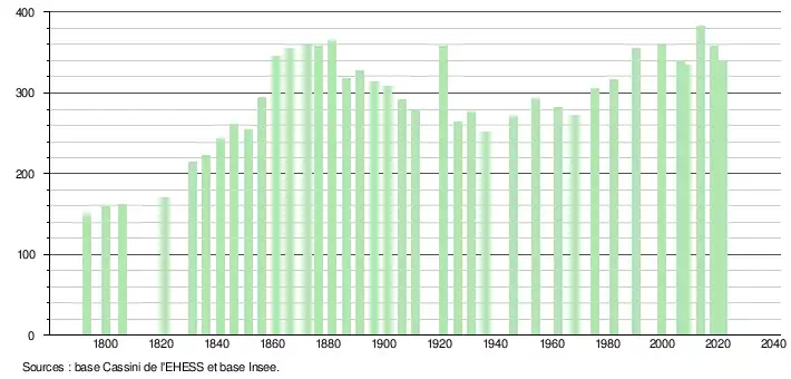L'évolution du nombre d'habitants est connue à travers les recensements de la population effectués dans la commune depuis 1793. Pour les communes de moins de 10 000 habitants, une enquête de recensement portant sur toute la population est réalisée tous les cinq ans, les populations légales des années intermédiaires étant quant à elles estimées par interpolation ou extrapolation[24]. Pour la commune, le premier recensement exhaustif entrant dans le cadre du nouveau dispositif a été réalisé en 2008[25].
