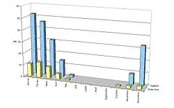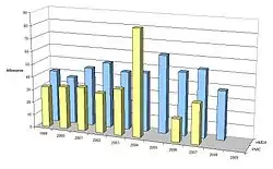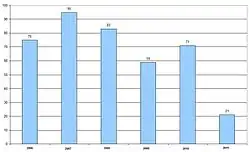 | 2005 | 1 (40,8) | 1 (40,8) | 8 (326,3) | 23 (938,0) | 69 (2 814,0) | 7 (285,5) | 1 (40,8) | 315,3 (313) |