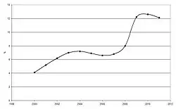 | 2004 | 3 (121,0) | 15 (604,8) | 33 (1 330,6) | 97 (3 911,3) | 6 (241,9) | 2 (80,6) | 431,8 (315) | |