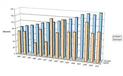 | 2007 | 1 (41,5) | 12 (498,5) | 18 (747,8) | 82 (3 406,7) | 5 (207,7) | 342,6 (305) | ||