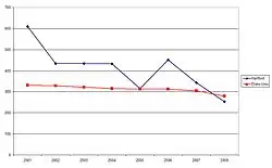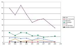 | Année | Viols | Vols à main armée | Agressions | Cambriolages | Vols | Vols de voitures | Incendies criminels | Indice de criminalité[21] |