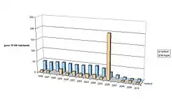 | 2001 | 5 (200,9) | 1 (40,2) | 16 (642,8) | 34 (1 366,0) | 119 (4 781,0) | 4 (160,7) | 609,0 (331) | |