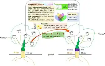 Le processus consiste à interposer entre le porte-greffe racine et le greffon cultivé un troisième agrume ou entre-greffe (ici au lieu d'une greffe d'harumi sur Hongjv (Citrus reticulata Blanco, CV. Hongjv) harumi est greffé sur une entregreffe ponkan elle-même greffée sur Hongjv). L'entregreffe induit une fructification précoce, augmente la qualité des fruits en régulant positivement les teneurs en saccharose, fructose et glucose, ainsi qu'en diminuant les teneurs en acides organiques et le poids du fruit. Le signal phytohormone est activé par des altérations des niveaux d'expression de 4 gènes liés au métabolisme des sucres, autrement dit l'entregreffe ponkan permet de réguler la qualité et la maturation du tangor harumi[16].