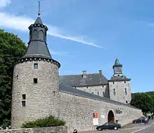 L'église de Harzé, vue depuis la cour arrière du château. | |||||