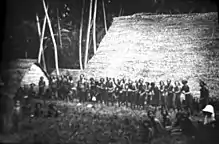 Le « village » central était alors formé d'un petit groupe de huttes au centre desquelles se trouvait un espace religieux sans parois, composé d'un toit et d'un parquet de grandes planches, et nommé vere yaris[15],[16],[14]. À une extrémité se trouvait une sorte d'« autel » et neuf statues humaines en bois, dont sept étaient des femmes[17]. Au centre du toit était suspendue une maquette de catamaran appelée le « bateau des esprits »[17].