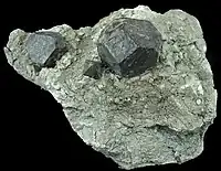 Octaèdres tronqués et octaèdre avec un minimum de modifications cubiques d'une hauérite d'Italie, dans une configuration complexe. Le plus grand cristal mesure 1,6 cm de diamètre. On ne voit presque jamais la hauérite dans une matrice parce qu'elle est faite de kaolinite décomposée. |