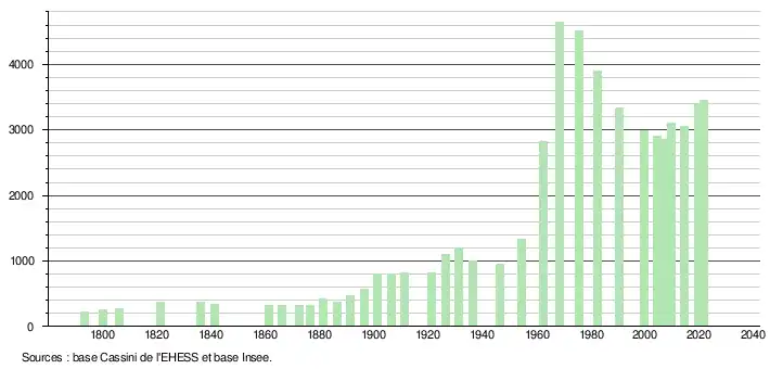 L'évolution du nombre d'habitants est connue à travers les recensements de la population effectués dans la commune depuis 1793. Pour les communes de moins de 10 000 habitants, une enquête de recensement portant sur toute la population est réalisée tous les cinq ans, les populations légales des années intermédiaires étant quant à elles estimées par interpolation ou extrapolation[26]. Pour la commune, le premier recensement exhaustif entrant dans le cadre du nouveau dispositif a été réalisé en 2004[27].