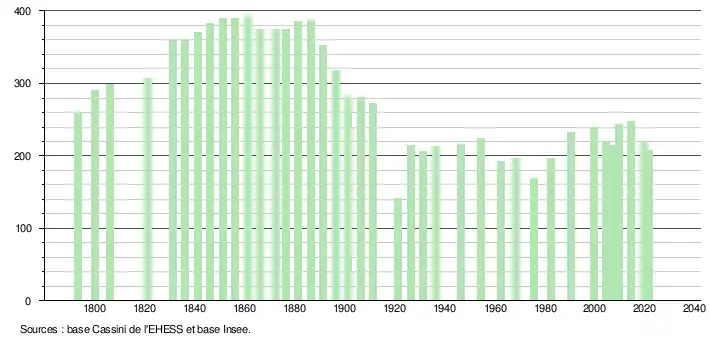 L'évolution du nombre d'habitants est connue à travers les recensements de la population effectués dans la commune depuis 1793. Pour les communes de moins de 10 000 habitants, une enquête de recensement portant sur toute la population est réalisée tous les cinq ans, les populations légales des années intermédiaires étant quant à elles estimées par interpolation ou extrapolation[32]. Pour la commune, le premier recensement exhaustif entrant dans le cadre du nouveau dispositif a été réalisé en 2004[33].